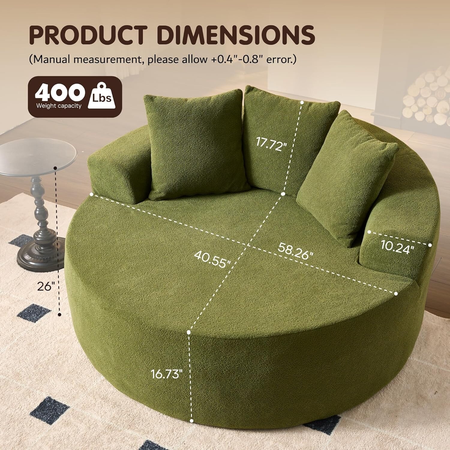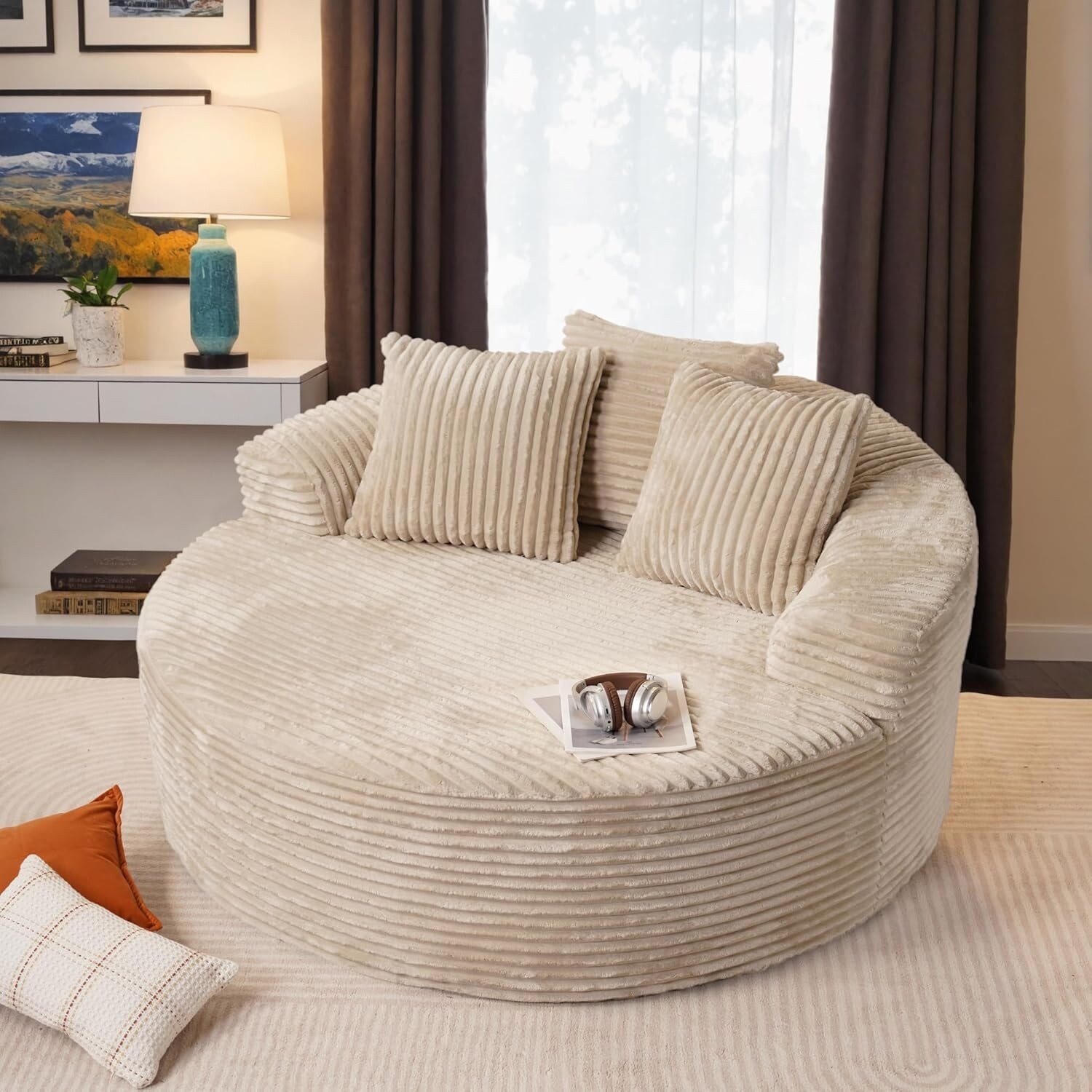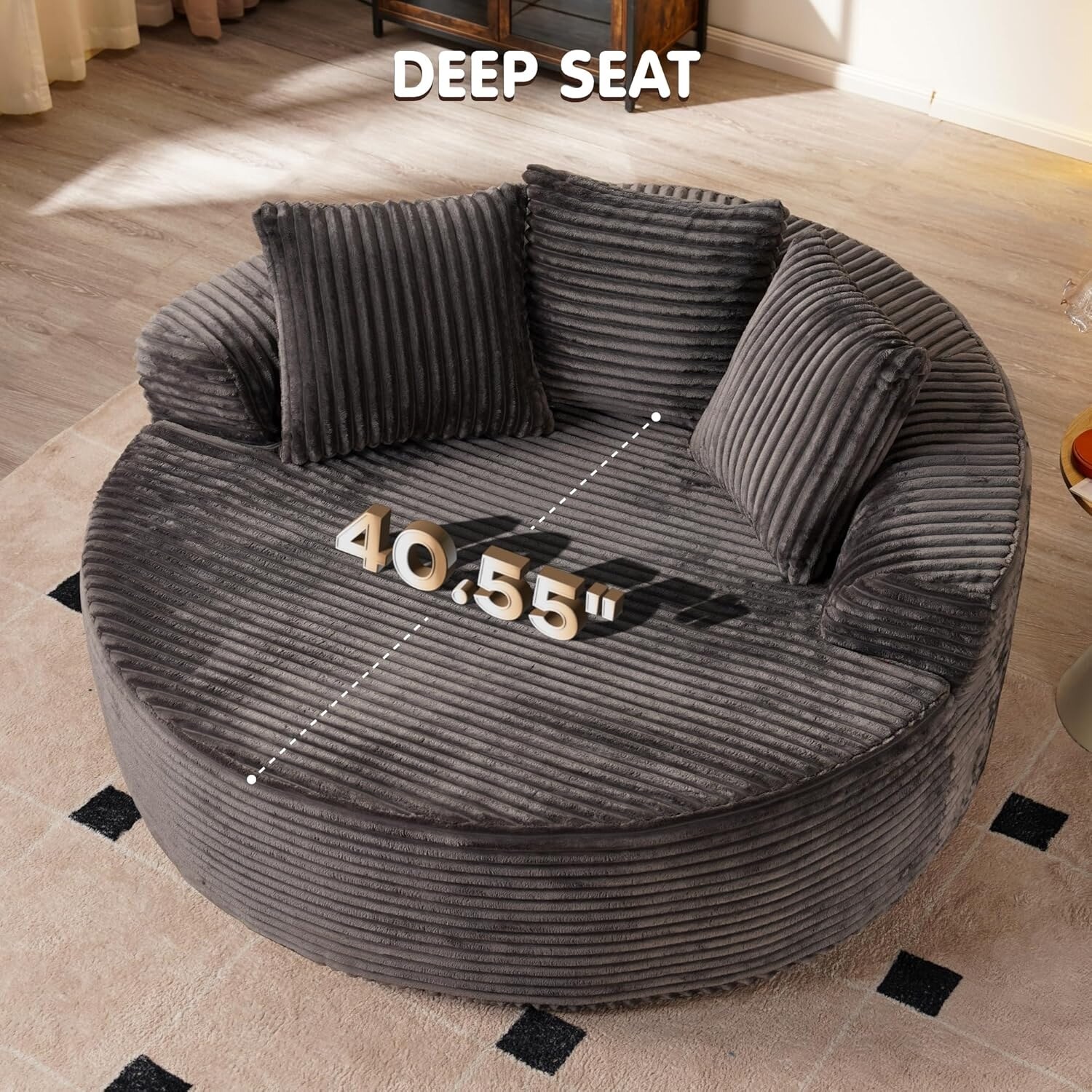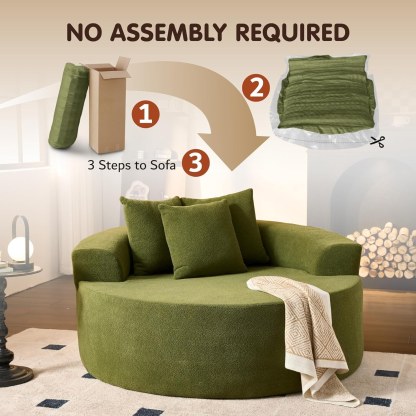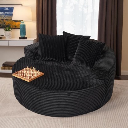 - Oversized Leisure Round Chair: Equipped with 10-inch wide square arms, providing loose and leisurely arm support. The 58" W*40" D seating is spacious enough for curling up, reading a book, or napping on the sofa.