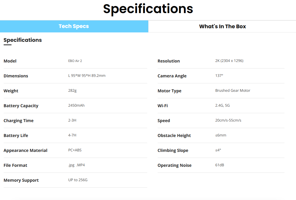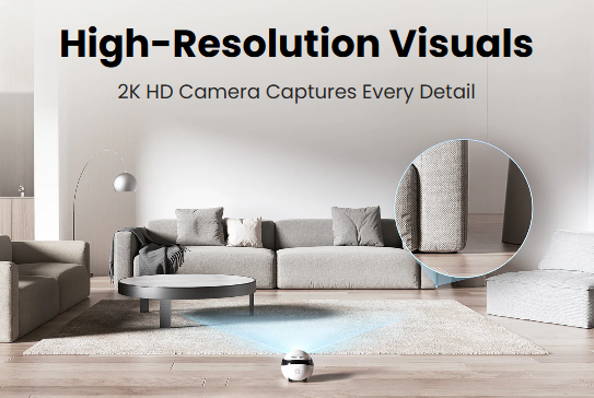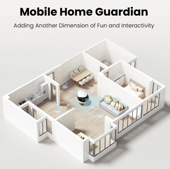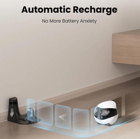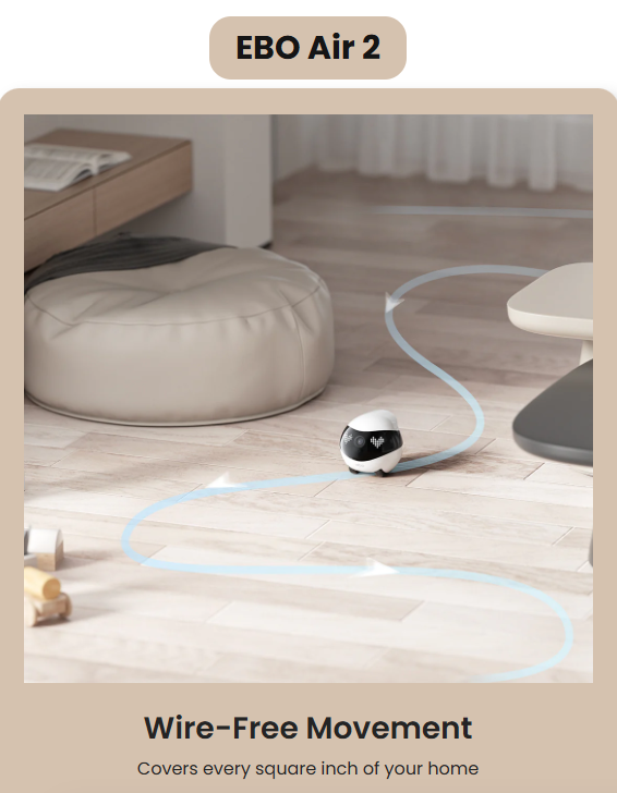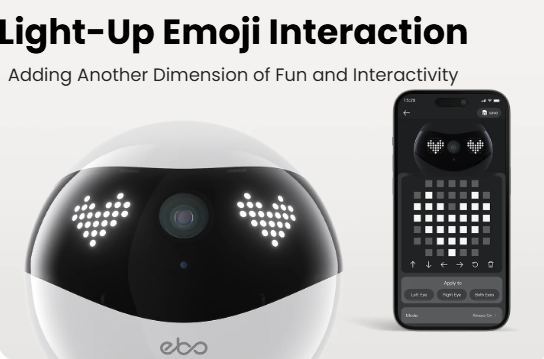 The EBO Air 2 is a smart companion robot with a 2K movable camera and AI security. It supports 24-hour recording, motion alerts, pet interaction via laser or two-way voice, and features custom emojis and a desktop clock.